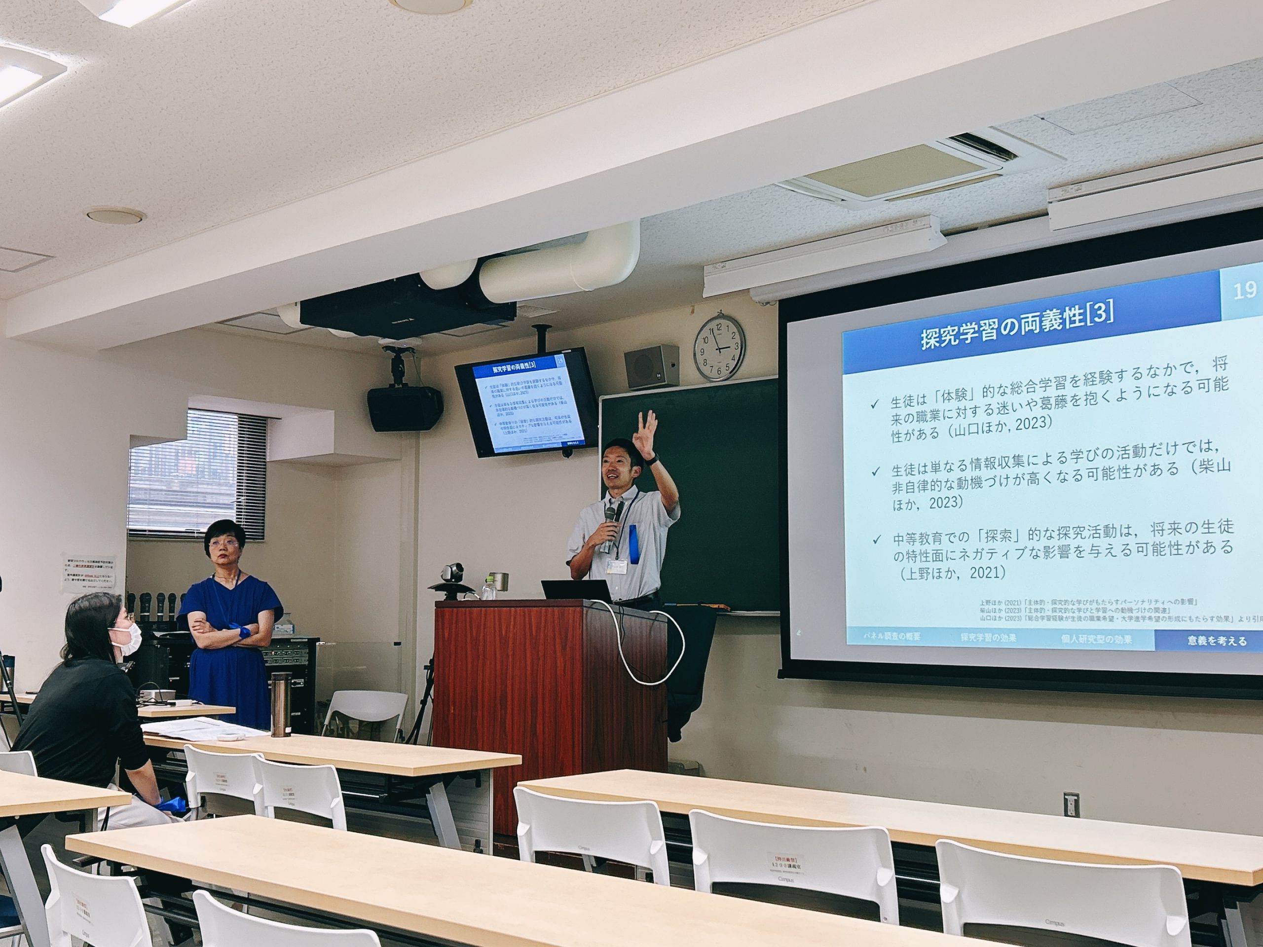 続いて上野特任講師が連携校での効果検証で明らかになった知見や探究学習の意義を考えるための視点を提示しました。